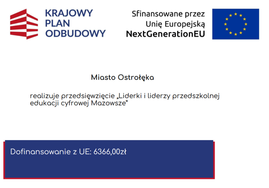 Mamy przyjemność poinformować, że Miasto Ostrołęka jako organ prowadzący dla placówki Przedszkole Miejskie Nr 13 „Kraina Przygód” w Ostrołęce przystąpiło do projektu edukacyjnego „Liderki i liderzy przedszkolnej edukacji cyfrowej Mazowsze” finansowanego ze środków UE NextGenerationEU – Instrumentu na Rzecz Odbudowy i Zwiększania Odporności, ramach Krajowego Planu Odbudowy – Reforma: C2.1: Zwiększenie skali zastosowań rozwiązań cyfrowych w sferze publicznej, gospodarce i społeczeństwie, Inwestycja C2.1.3: E-kompetencje.