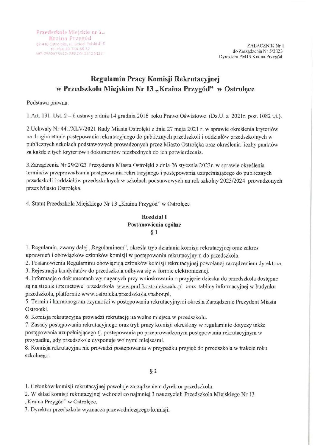 Regulamin Pracy Komisji Rekrutacyjnej w Przedszkolu Miejskim Nr 13 Kraina Przygód_compressed